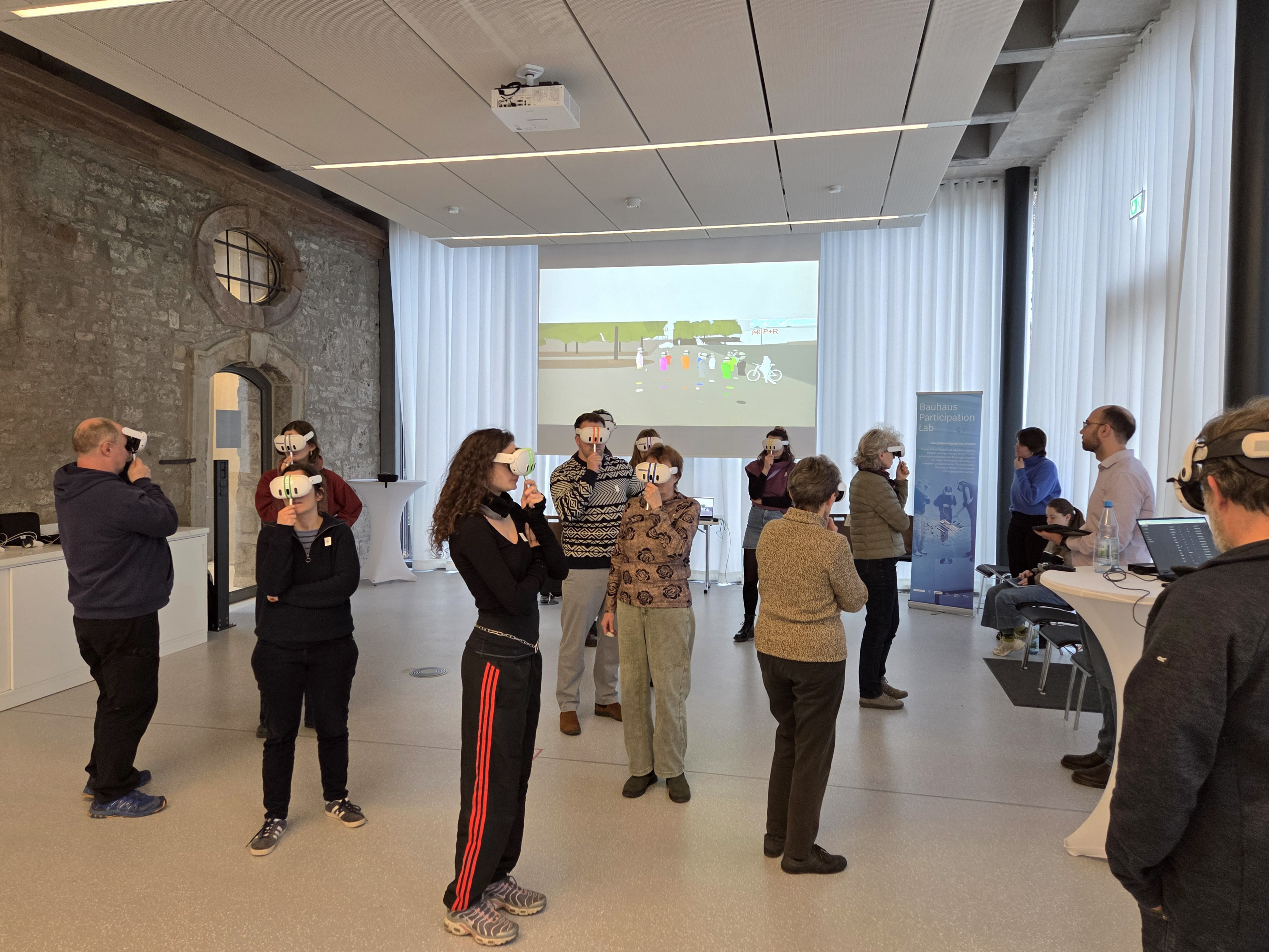 In kleinen Gruppen erleben die Teilnehmenden maßstabsgetreue Entwurfsvarianten aus relevanten Perspektiven (z. B. Fußgänger). Ziel ist ein gemeinsames räumliches Verständnis und ein niedrigschwelliger Einstieg in die VR/AR Technik.
